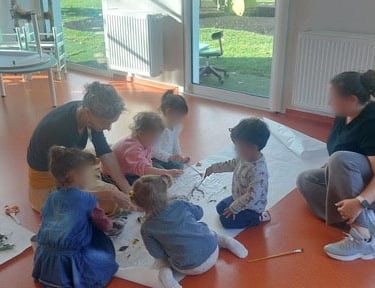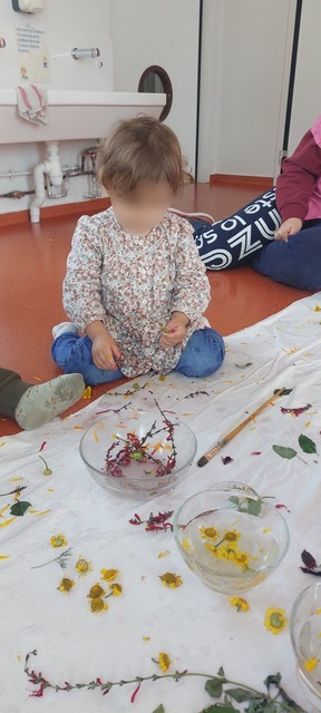Pour clôturer cette expérience, nous avons créé ensemble une fresque végétale : les enfants ont collé des pétales sur une grande feuille blanche, simplement à l’aide d’un peu d’eau. Le résultat ? Une œuvre collective pleine de douceur et de couleurs, reflet de leur émerveillement.