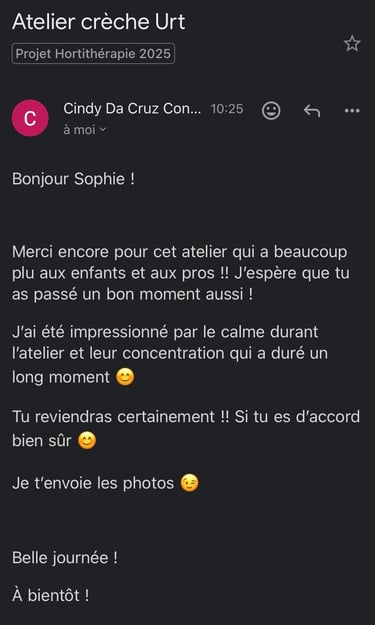 Cette semaine, j’ai eu le plaisir d’animer un atelier d’hortithérapie à la crèche de Urt, placé sous le signe de la découverte sensorielle. Les tout-petits ont plongé dans un univers végétal doux, coloré et parfumé, où chaque plante devenait une invitation à explorer le monde autrement.