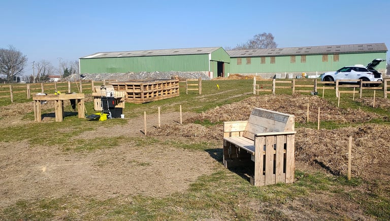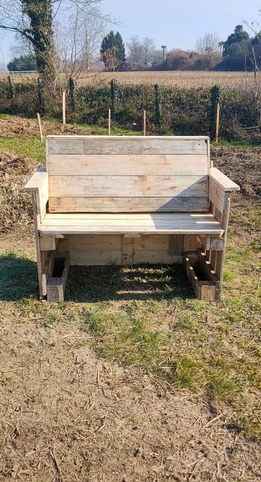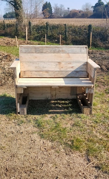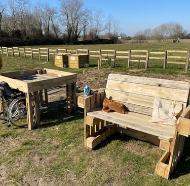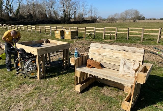 Ces bacs surélevés facilitent le jardinage pour les personnes à mobilité réduite ou souffrant de douleurs dorsales, tout en rendant les plantations accessibles à tous.Fabrication de bancs en palettes, installés à différents endroits du jardin.