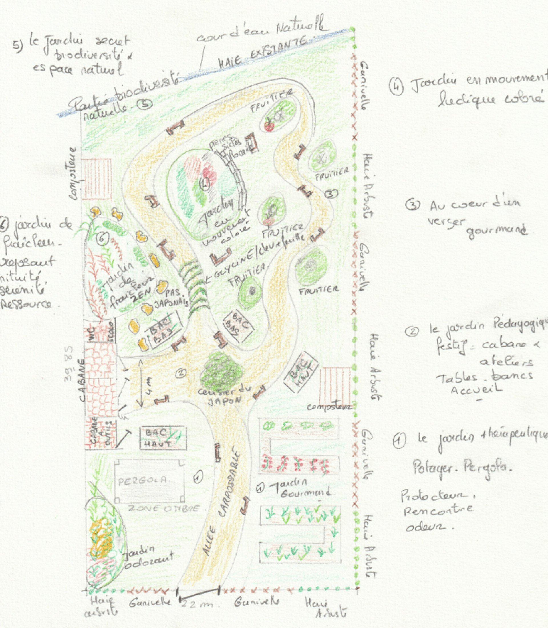 Chaque recoin du jardin a été pensé sur plan, afin d’organiser harmonieusement les espaces : potager, verger, coin aromatique, zone de compost, et coin détente sensoriel.